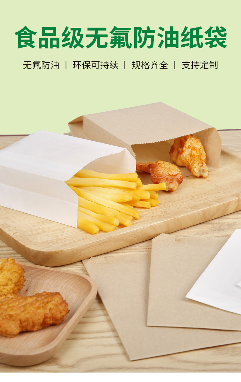无氟防油纸袋不含氟化合物(pfoa/s),可直接接触食品,安全健康。防油性能优异(防油等级kit-6,可防85℃热油,满足多种需求。)